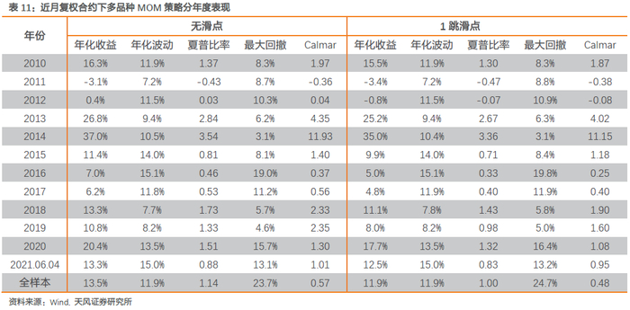 策略回撤主要发生的阶段与MOM策略类似,但整体最大回撤明显小于MOM策略;