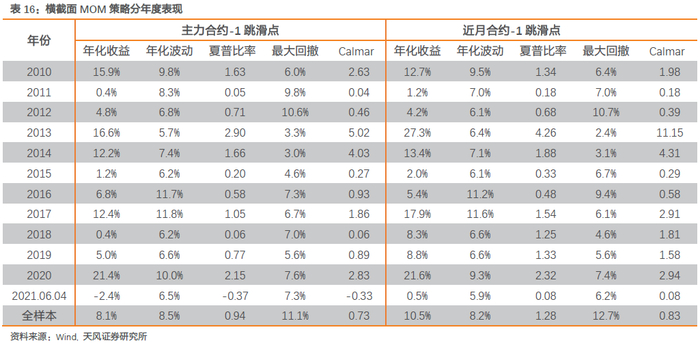 主力合约策略回撤主要发生在2017至2019大宗商品震荡市期间,整体最大回撤小于上述MOM策略和DMAC策略,尤其是近月合约策略,最大回撤仅10%,且1跳滑点成本下依然每年都能获取正收益;