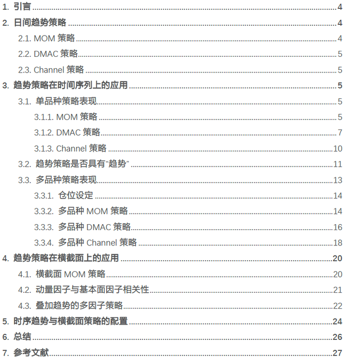 时间序列上,具体讨论:1. 用主力合约还是活跃近月合约构建趋势策略;2. 趋势信号来自同一合约真实价格还是基于合约复权后的价格;3. 哪些品种的趋势特征更明显;4.趋势策略表现是否具有“趋势”,即历史表现好的品种是否更有效;5. 多品种策略的仓位管理问题。