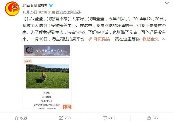 2018年10月,北京市朝阳区人民法院还拍卖过一只柴犬“登登”。2014年12月,“登登”被主人送到一家宠物寄养中心,4年过去,主人不仅没有现身,还拖欠着寄养中心费用。因此,法院决定拍卖“登登”,既帮它找个新主人,也能通过拍卖的钱弥补寄养中心的损失。消息一出,马上有大量网友报名想要带走“登登”。随后,“登登”的主人联系了法院,表示自己身在国外,愿意赔偿拖欠寄养中心的6.3万余元。法院表示,若能按时支付欠款,“登登”的拍卖也就可以取消了。
