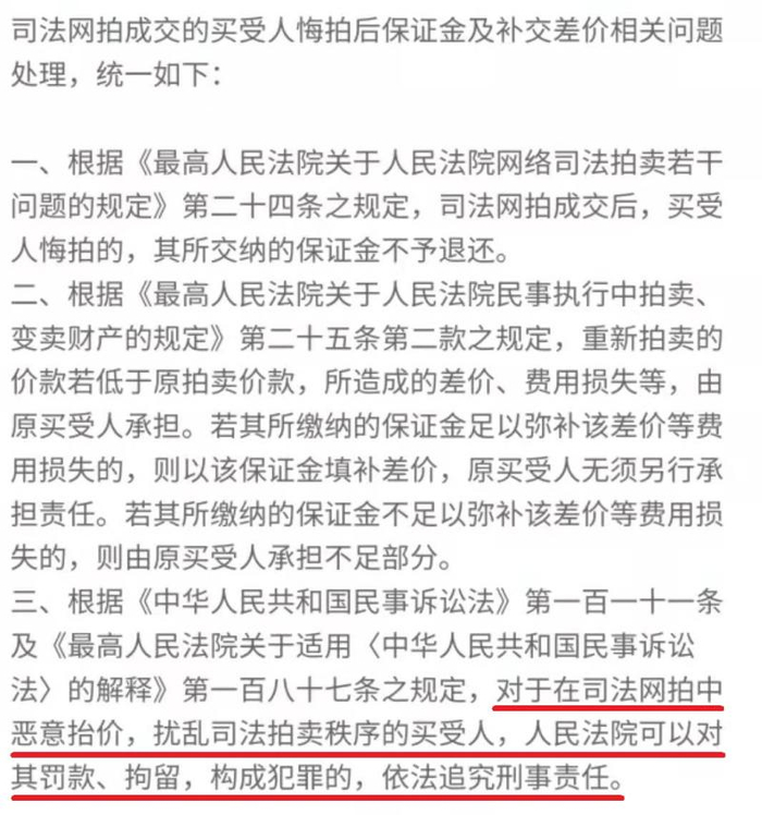 其实,在司法拍卖界面就有着清晰的提示:根据《中华人民共和国民事诉讼法》第111条及《最高人民法院适用<中华人民共和国民事诉讼法>的解释》第187条之规定,对于在司法网拍中恶意抬价、扰乱司法拍卖秩序的买受人,人民法院可以对其罚款、拘留,构成犯罪的,依法追究刑事责任。