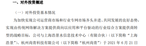 公司本次联合上海浩景、杭州尚青共同设立合资公司,旨在发挥各方在各自领域的优势,形成产业联盟,扩展覆盖采集、连接、计算、存储、应用等多个领域的产品及数字化端到端解决方案。公司拟以“二元水环境数字地图”为业务引导,以水资源领域为抓手,聚焦重点行业有针对性地继续开拓行业专网市场,有效助推云网融合战略在行业专网市场的布局和应用,推进水利水务数字化转型,以提高公司在重点行业的竞争优势,加快实现公司运营商市场和行业专网市场齐头并进、共同发展的良好态势,实现由传统网络解决方案提供商向以应用和平台驱动的行业综合方案提供商转型的战略目标。