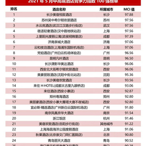 以下是迈点研究院独家发布的“2021年5月中高端酒店竞争力指数百强榜单”,迈点酒店竞争力指数(MCI)通过监测单体酒店在互联网和移动互联网的用户点评、企业运营数据,用以反映一段时期内的酒店运营力和客群喜爱度,可为企业及行业相关人士进行运营决策、市场分析判断提供参考。