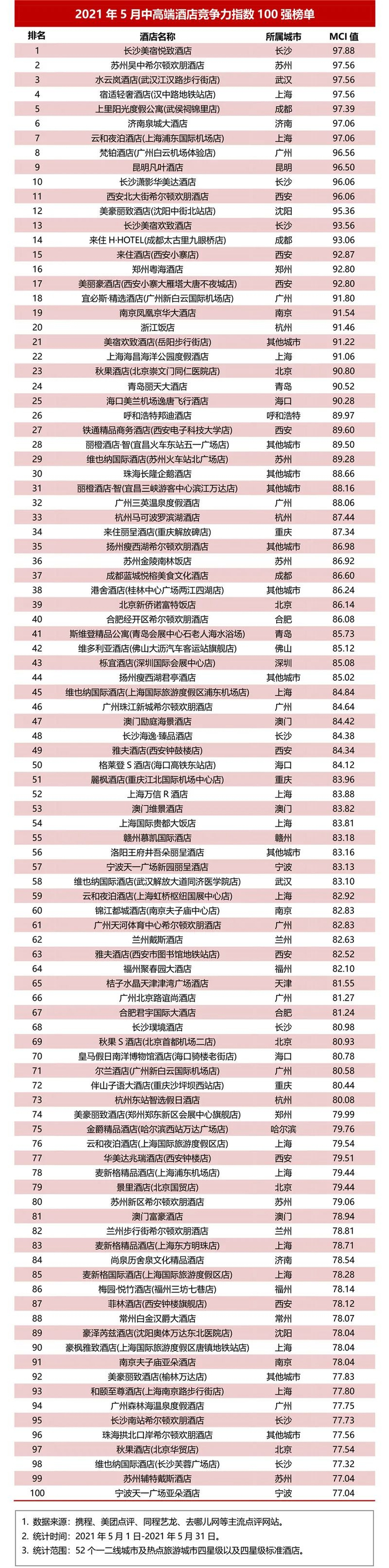 2021年5月中高端酒店竞争力指数100强榜单
