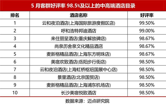 10家酒店好评率98.5%及以上,超八成百强中高端酒店客群好评率在95%以上