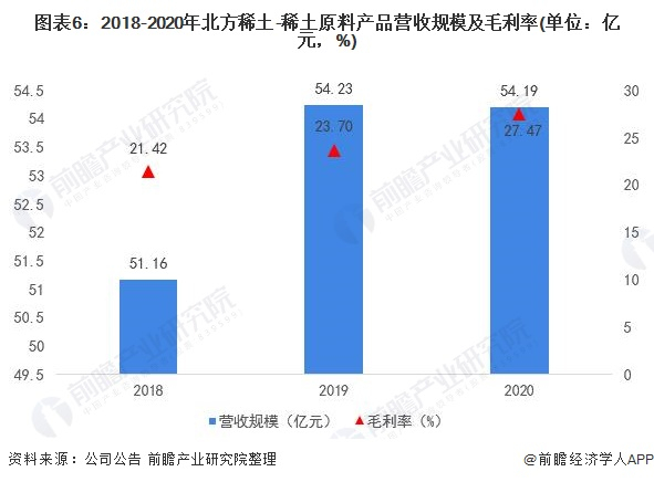 在营收方面,2020年北方稀土原料产品营收规模出现小幅下滑趋势。不过,公司稀土原料产品整体毛利率再度提升,达到27.47%。