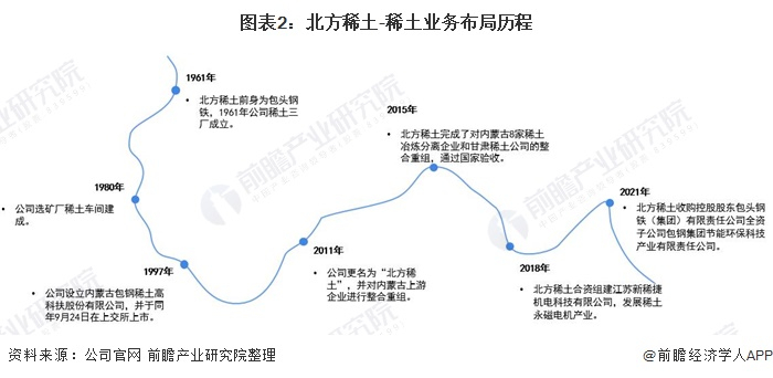 北方稀土前身为包头钢铁,1961年公司稀土三厂成立。1980年,公司选矿厂稀土车间建成。1997年,公司设立内蒙古包钢稀土高科扶股份有限公司,并于同年9月24日在上交所上市。2006年,公司完成了股份分置改革,并开始使用“白云鄂博”注册商标。2015年,北方稀土完成了对内蒙古8家稀土冶炼分离企业和甘肃稀土公司的整合重组,通过国家验收。2018年,北方稀土合资组建江苏新稀捷机电科技有限公司,发展稀土永磁电机产业。2021年,北方稀土收购控股股东包头钢铁(集团)有限责任公司全资子公司包钢集团节能环保科技产业有限责任公司。
