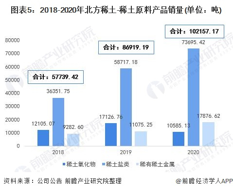 在产量方面,2018-2020年,北方稀土原料产品产量逐年增长。2020年,公司稀土原材料产品产量为102157.17吨,其中稀土氧化物产量为10585.13吨;稀土盐类产量为73695.42吨;稀有稀土金属产量为17876.62吨。