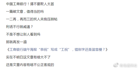 所以,可能就发生了先前的一幕,工行可跟知名自媒体博主联系要求删帖,结果没想到知名自媒体也是一个硬茬,就是不顺从,言语之间可能引发了一些矛盾。