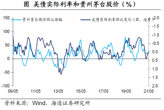 值得一提的是,梁中华还在研报中指出,美债实际利率不仅影响黄金的价格走势,它和茅台股价走势也有一定的相关性。