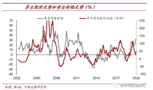 他指出:“稀缺资产更受益:买茅台=买黄金。长期来看,如果全球纸币不断超发,只要供给速度较慢能够长期存活下来的资产,其以纸币标价的名义价格都是受益的。茅台公司的股价和黄金价格的走势有很大相关性。当然我们并不是要在当前时点去推荐茅台个股,只是以此为例提供一种全球纸币滥发情况下的大类资产配置思路。过去十几年,核心优质公司的股价不断创新高,优质资产长期更加受益。”