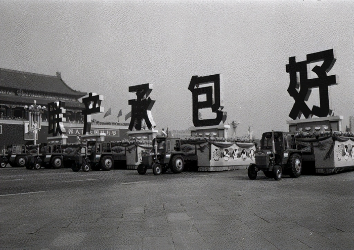 1984年新中国成立35周年庆祝活动,游行彩车打出“联产承包好”标语