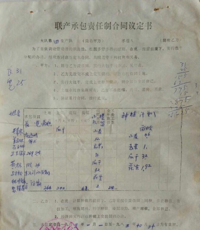 山东地区一份20世纪80年代的《联产承包责任制合同议定书》