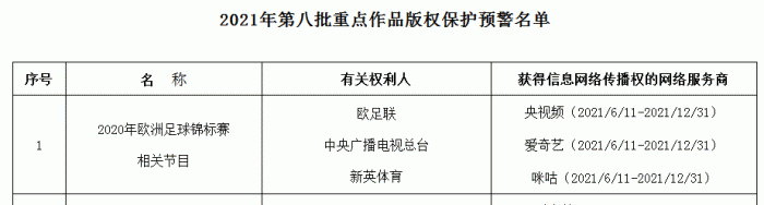 近期,国家版权局也发布了《关于进一步加强互联网传播作品版权监管工作的意见》及版权重点监管工作计划,公布了2021年度第八批重点作品版权保护预警名单,欧洲杯赫然在列,这也将继续提升监测监管力度,对不法行为进行更快查处。