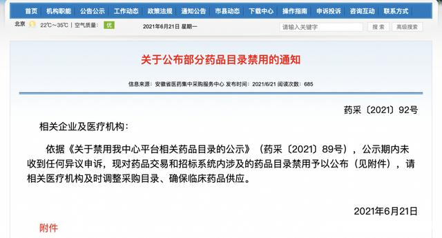 6月21日,安徽省医药集中采购平台发布《关于公布部分药品目录禁用的通知》及清单。该平台对药品交易和招标系统部分注销批准文号及重复申报药品目录予以禁用。