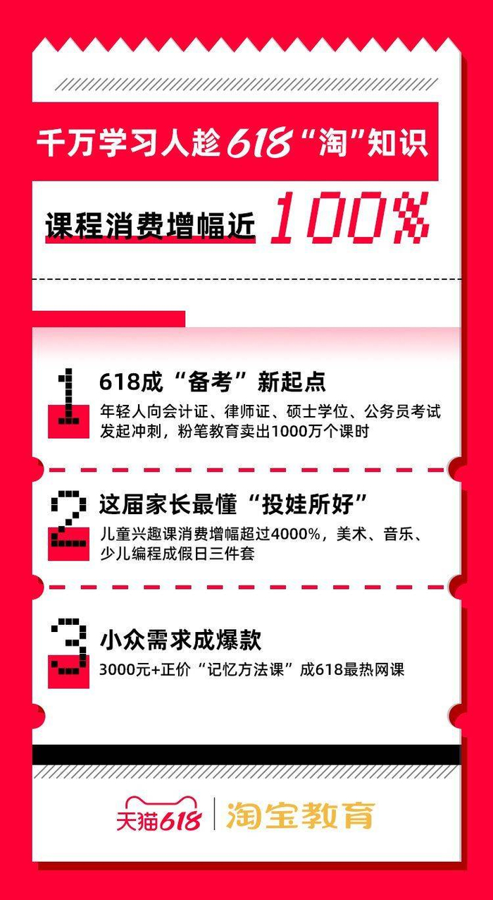 6月21日,淘宝教育发布的数据显示,618期间超千万学习人“找课求学”,教育消费增长近100%,其中考试考证类课程消费最多。以公务员考试课程为例,这届考生单单从粉笔旗舰店就买走了1000万个课时。名师好课之外学习方法的提升也备受关注。网易云课堂刚开店就迎来爆发,店铺主推的最强大脑选手卢菲菲记忆课成为618最热网课之一。课程单价3480元,却不妨碍数以千计的用户借618优惠下单。年轻人奔赴胜券在握的考试,父母则为熊孩子的兴趣学习操心,儿童兴趣课在618期间的消费增幅超过4000%,美术、音乐、少儿编程成假日三件套。