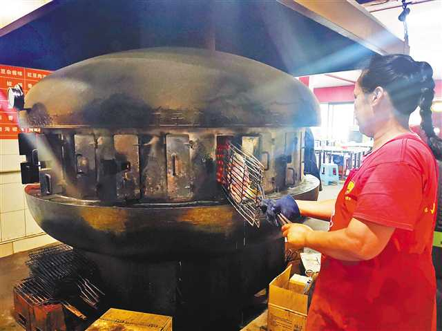万州烤鱼经营户用炭火转炉烤鱼。记者陈维灯摄/视觉重庆