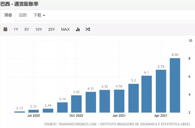 百年一遇的干旱,导致巴西农产品价格、食品价格、电力价格全部飙升,直接导致当地通货膨胀率“爆表”。2021年5月,巴西的CPI年率激增8.06%,是该国央行通胀目标3.75%的两倍多,创近五年来最大涨幅,远超市场预测。