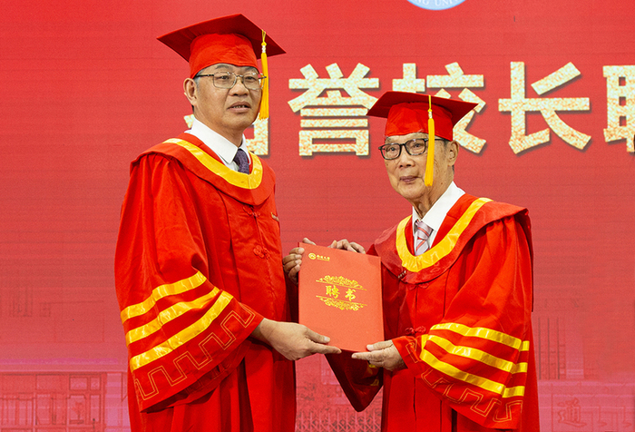 南通大学党委书记浦玉忠为全国政协原常委、全国工商联原常务副主席张绪武(右)颁发名誉校长聘书。南通大学官网 图