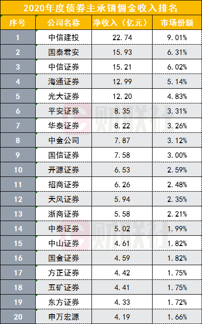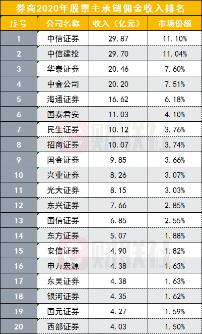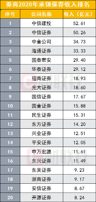 券商2020年承销保荐收入排名前十分别为中信建投(52.61亿元)、中信证券(50.26亿元)、中金公司(34.73亿元)、海通证券(33.33亿元)、国泰君安(29.40亿元)、华泰证券(29.12亿元)、招商证券(18.93亿元)、光大证券(18.60亿元)、国信证券(17.67亿元)、国金证券(15.88亿元)。