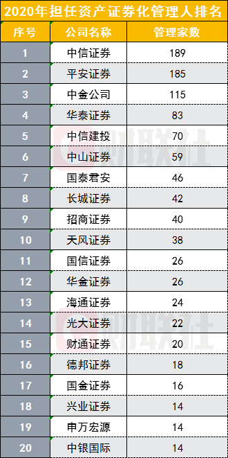 担任资产证券化管理人家数排名前十的券商分别是中信证券(189家)、平安证券(185家)、中金公司(115家)、华泰证券(83家)、中信建投(70家)、中山证券(59家)、国泰君安(46家)、长城证券(42家)、招商证券(40家)、天风证券(38家)。