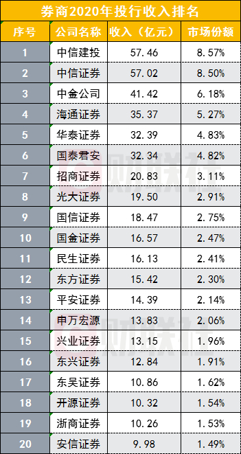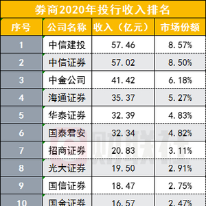 中证协近期公布数据显示,证券公司2020年度投行业务收入排名前10名分别为,中信建投(57.46亿元)、中信证券(57.02亿元)、中金公司(41.42亿元)、海通证券(35.37亿元)、华泰证券(32.39亿元)、国泰君安(32.34亿元)、招商证券(20.83亿元)、光大证券(19.50亿元)、国信证券(18.47亿元)、国金证券(16.57亿元)。