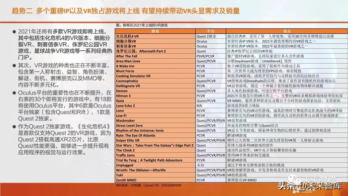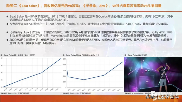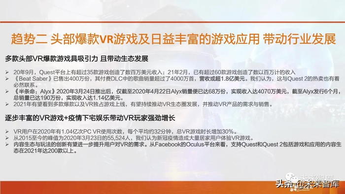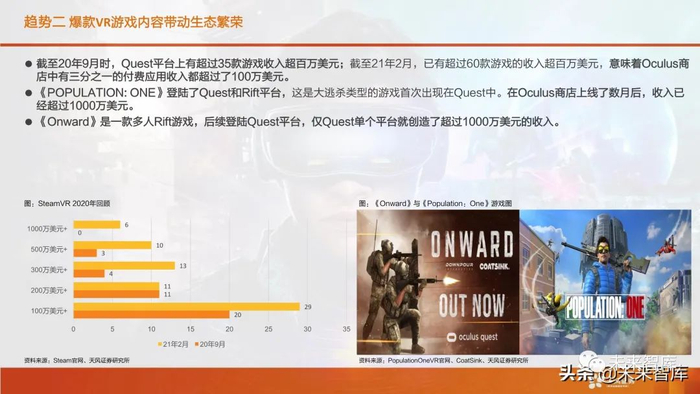 截至20年9月时,Quest平台上有超过35款游戏收入超百万美元;截至21年2月,已有超过60款游戏的收入超百万美元,意味着Oculus商 店中有三分之一的付费应用收入都超过了100万美元。