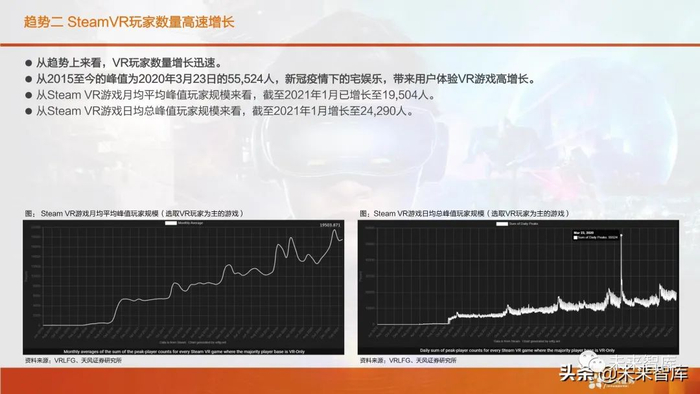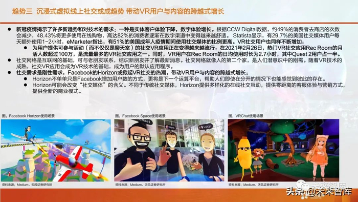 新冠疫情揭示了许多新趋势和对技术的需求:一种是实体客户体验下降,数字体验增长。约49%的消费者去商店的次数 会减少,48.43%将更多使用在线购物,高达82%的消费者逐渐在数字渠道中变得越来越舒适。 有29.7%的美国社交媒体用户每 天额外使用1-2小时,eMarketer指出,有51%的美国成年人疫情期间使用社交媒体的比例更高。VR社交用户也同样不断增加:为用户提供可参与活动(而不仅仅是聊天室)的社交VR应用正在变得越来越流行:在2021年2月26日,热门VR社交应用Rec Room的月 活人数超过100万,是流量最多的VR社交应用之一。同时,VR用户在Rec Room的日均使用时长为2.7小时,其中Quest 2用户占一半。