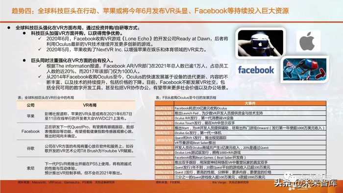 科技巨头加强VR方面并购,以获得竞争优势。 2020年6月,Facebook收购VR游戏《Lone Echo》的开发公司Ready at Dawn,后者将 利用Oculus最新的VR技术继续开发更多创新的游戏。2020年5月,苹果收购了NextVR Inc. 以增强苹果在娱乐和体育领域的VR实力。