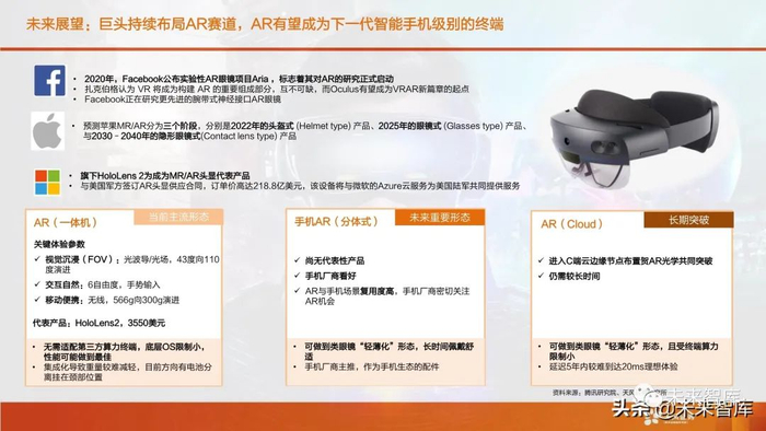 2020年,Facebook公布实验性AR眼镜项目Aria ,标志着其对AR的研究正式启动 ;扎克伯格认为 VR 将成为构建 AR 的重要组成部分,互不可缺,而Oculus有望成为VRAR新篇章的起点 ;Facebook正在研究更先进的腕带式神经接口AR眼镜。预测苹果MR/AR分为三个阶段,分别是2022年的头盔式 (Helmet type) 产品、2025年的眼镜式 (Glasses type) 产品、 与2030–2040年的隐形眼镜式(Contact lens type) 产品。