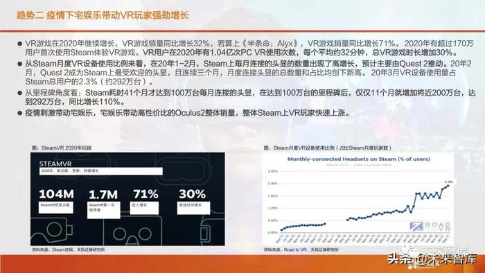 从里程碑角度看:Steam耗时41个月才达到100万台每月连接的头显,在达到100万台的里程碑后,仅仅11个月就增加将近200万台,达 到292万台,同比增长110%。疫情刺激带动宅娱乐,宅娱乐带动高性价比的Oculus2整体销量,整体Steam上VR玩家快速上涨。