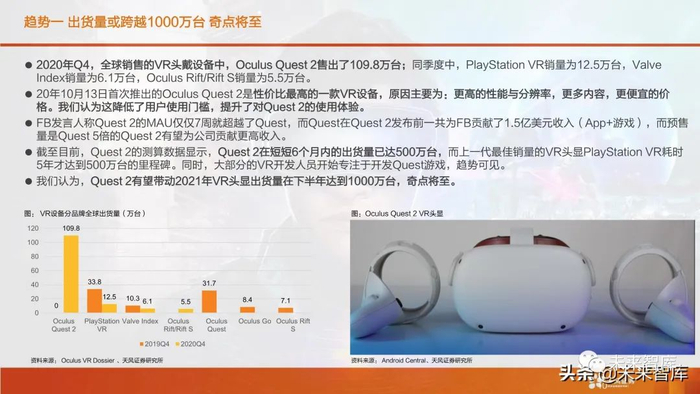 2020年Q4,全球销售的VR头戴设备中,Oculus Quest 2售出了109.8万台;同季度中,PlayStation VR销量为12.5万台,Valve Index销量为6.1万台,Oculus Rift/Rift S销量为5.5万台。20年10月13日首次推出的Oculus Quest 2是性价比最高的一款VR设备,原因主要为:更高的性能与分辨率,更多内容,更便宜的价 格。我们认为这降低了用户使用门槛,提升了对Quest 2的使用体验。