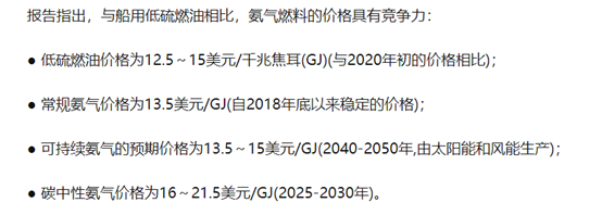 氨能源利用效率较高。以相同运力需求的船舶为例,在与众多能源的比较中。氨能源价格排倒数第四低,在重量与体积的比较下,重量低、体积小、密度大,在排名中处于较好的上游排名。而在环境清洁方面氨是仅次于氢的。