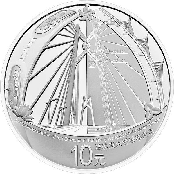 2018年10月24日发行港珠澳大桥通车银质纪念币正面和背面图案