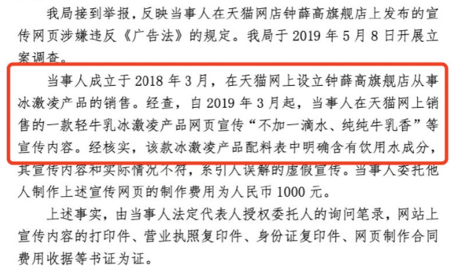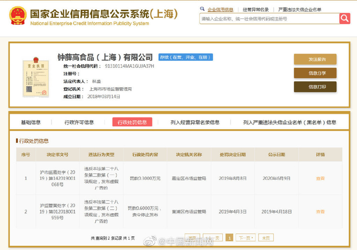 钟薛高曾两次因发布虚假广告被处罚。/微博@中国新闻网