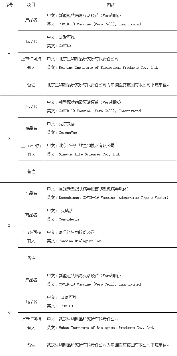 本次列入清单的新冠疫苗一共四款,分别是:
