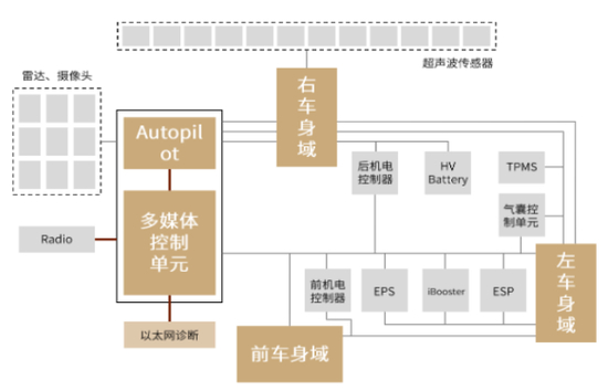图表:Tesla Model 3中域融合架构已经初见雏形