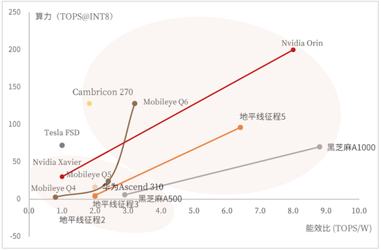 图表:主要车载AI SoC算力与能效比情况