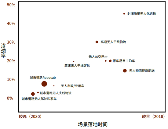 注:1)渗透率指2030年的当年的渗透率(当年新车销量占比或当年服务单量占比);2)场景落地时间指该场景首次实现规模化商业应用的时间节点,起泡大小表示该场景所需自动驾驶套件在2030年的潜在市场规模