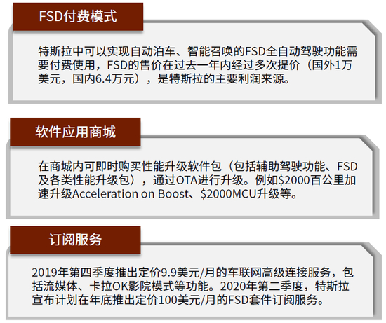 ► 功能型软件优先内置硬件冗余性能,后续依靠OTA升级销售。传统模式下,车企在车型设计初期就需将软硬件定义固化,Tesla的模式则将冗余硬件预装,后续通过软件升级来开放功能回收成本。例如,车主可以在TeslaAPP 中购买激活更新服务,比如动力性能加速、座椅加热、智能召唤等功能。其中智能召唤对于选装了完全自动驾驶能力、升级到V10系统的车型无需另外付费;动力性能(售价2000美元)加速针对Model 3 长续航全驱版和Model Y 长续航版开放,座椅加热(售价300美元)对Model 3车型开放。