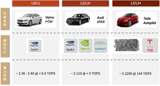 ► 量价趋势上,1)L2及以下系统仍采用分布式架构,因此L0->L2升级过程中SoC数量线性增加。L0/L1级别的ADAS只具备环境感知和简单的车辆控制功能,以传统一级供应商和半导体厂商合作提供解决方案为主,技术难度较低。而随着Mobileye成功探索出视觉解决方案之后,L2/L2+级别芯片算力得到提高,价格也随之上升数倍。2)达到L3级后,我们认为集中式架构将取代分布式,SoC数量会大幅降低,但L3级别以上车辆功能更加复杂,中央计算单元控制范围大幅扩大,带来了SoC芯片算力的大幅提升,相应价格也成倍增加。