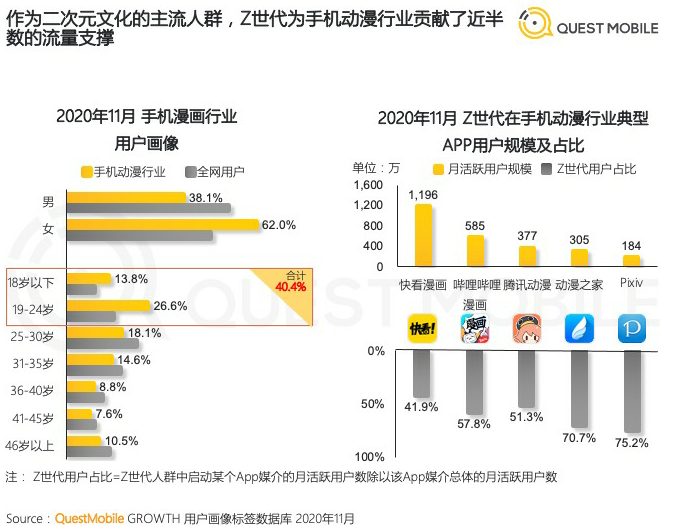 毫无疑问,Z世代是二次元文化的主流人群。根据QuestMobile数据显示,手机漫画行业用户年龄画像中,Z世代占比40.4%。与之相匹配的是Z世代对相关产业的付费意愿。