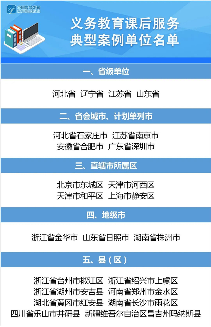 据教育部官方微信消息,近日,教育部办公厅发布《关于推广部分地方义务教育课后服务有关创新举措和典型经验的通知》(下称《通知》),从推动课后服务全覆盖、保证课后服务时间、提高课后服务质量、强化课后服务保障、加强督导检查等五方面遴选确定首批23个义务教育课后服务典型案例单位,号召各地结合实际学习借鉴经验,切实打通学校课后服务“最后一公里”, 推动课后服务全覆盖。