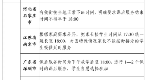 在课后服务的具体时间上,上述通知提到,课后服务结束时间原则上不早于当地普遍的正常下班时间后半小时;对有特殊需要的学生,可以提供延时托管服务,切实解决好家长接学生困难问题。