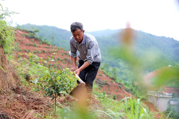钟得五继孙钟来发在给自家新种的油茶林除草。