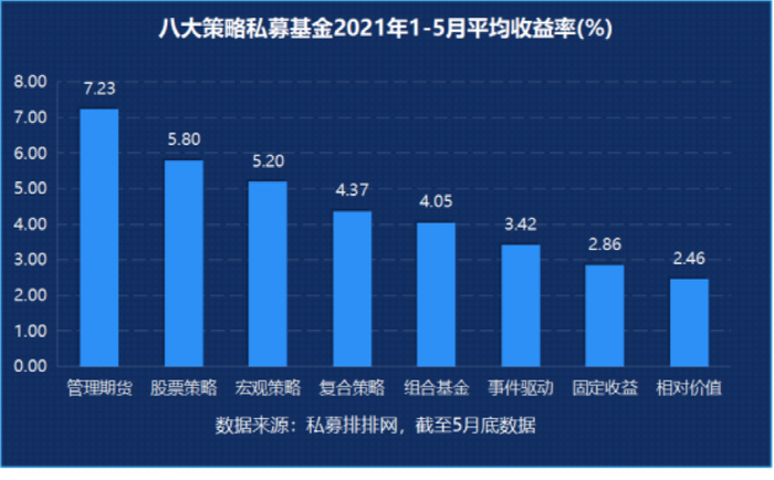 私募排排网数据显示,从私募八大策略来看,管理期货策略前5月平均收益7.32%居于首位,1-5月收益最高的管理期货私募收益高达96.44%,不同规模期货策略私募平均收益全部为正。0-5亿小规模管理期货私募今年较为惊艳,1-5月整体收益8.75%,排名位列第一。