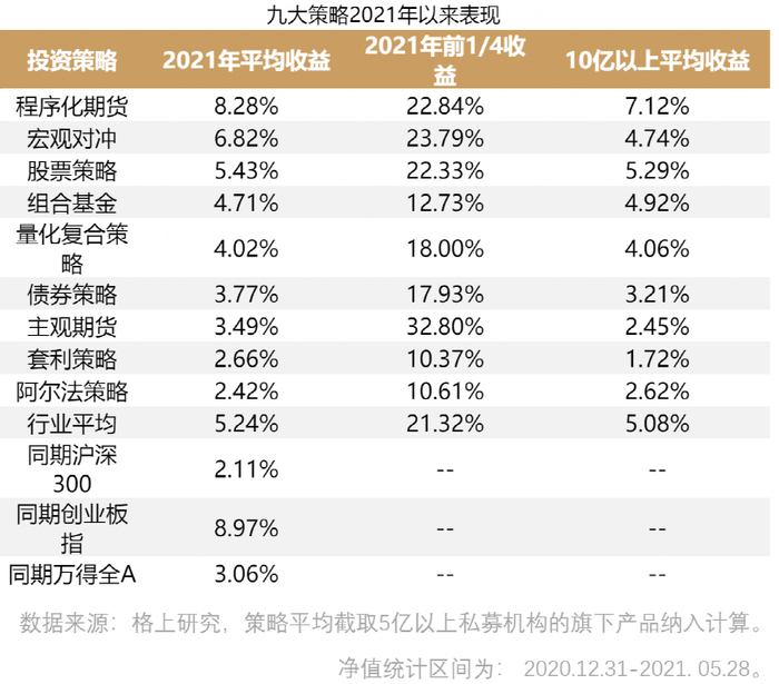 格上研究数据也显示,今年前5个月程序化期货策略是私募九大策略中表现最好的,其2021年的平均收益为8.28%;其中,前四分之一的产品平均收益率为22.84%,10亿以上平均收益率为7.12%。值得注意的是,5月份商品市场宽幅震荡,CTA策略基金在上半月超额突出,下半月收益有所回吐,但仍然录得单月3.06%的平均收益率。