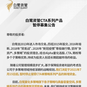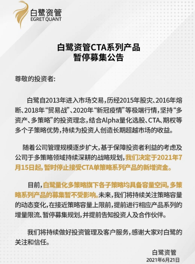 6月21日,华东知名量化私募机构白鹭资管发布CTA系列产品暂停募集公告。白鹭资管称,随着公司管理规模逐步扩大,基于保障投资者利益的考虑及公司于多策略领域持续深耕的战略规划,“我们决定于2021年7月15日起,暂时停止接受CTA单策略系列产品的新增资金。”