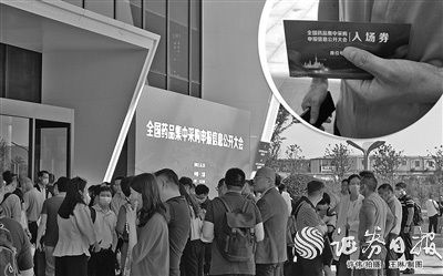 6月23日,各方代表在全国药品集中采购申报信息大会场地门口候场,参会企业代表向记者展示纸质入场券