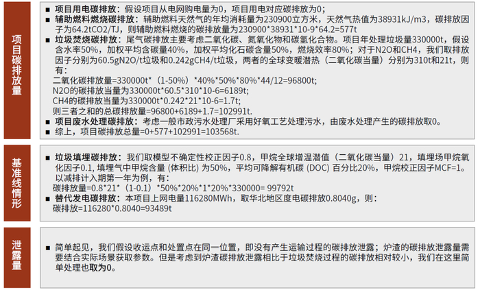 更加清楚地,我们以垃圾焚烧项目为例来看:基准情形排放量主要考虑两部分碳排放量的加总:(1)垃圾处理的替代方案碳排放量,(2)与垃圾焚烧项目产生相同电量的替代方案的碳排放量;项目排放量主要考虑四部分碳排放量的加总:(1)项目活动现场使用电量产生的碳排放,(2)项目活动现场使用化石燃料产生的碳排放,(3)垃圾焚烧产生的碳排放,(4)项目产生的废水处理需求的碳排放;泄漏碳排放量主要考虑两部分碳排放的加总:(1)垃圾从收运点转往新处置点运输过程中的碳排放,(2)在焚烧过程中产生的剩余物碳排放。